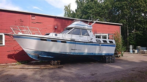 Bahama 35 fot med 2 x 250 hk diesel. Motorene er trolig mulige og fixe..